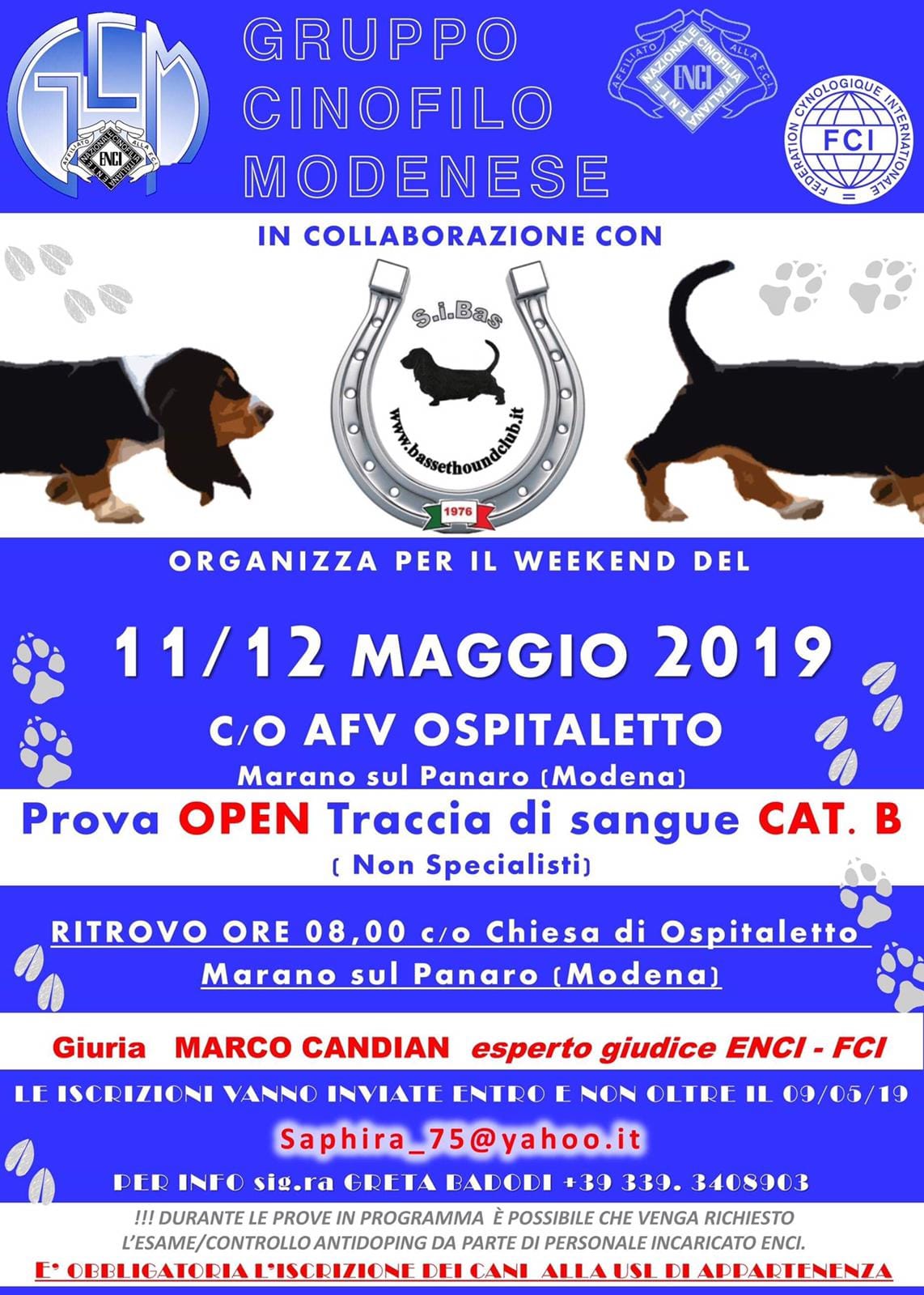 - 11 e 12 maggio 2019, prova OPEN su traccia di sangue per bassethound a Modena. Di seguito il modulo per la pre-iscrizione che va inviato entro il 12 aprile. Maggiori informazioni direttamente presso la Socia Greta Badodi!